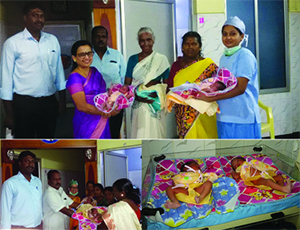 I.V.F. முறையில் பிறந்த இரட்டைக் குழந்தைகளை Dr.R.சேகர், Dr.J.அசோகன், Dr.V.காரிமுத்து, Mr.Rசெல்வமணி (நிர்வாக இயக்குனர் , தமிழ்நாடு மருத்துவமனை) ஆகியோர் முன்னிலையில் Dr.சித்ரா அவர்களால் பெற்றோரிடம் ஒப்படைக்கப்பட்டது.